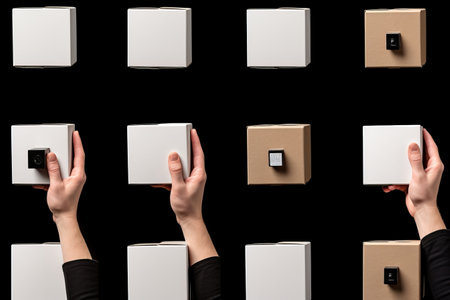 Express Delivery in Monochrome: Arm and Finger in a Vertical Collage of Spin Mini Carton Box Shipment, Isolated on a Creative Background