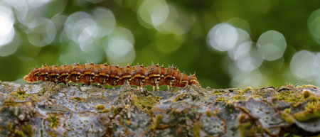 Close up of caterpillar on tree branch with bokeh background