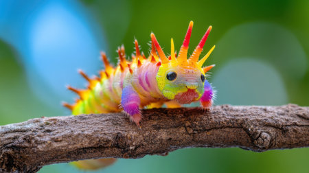 A stunning close-up image of a colorful caterpillar crawling on a brown twig against a blurred green backdrop, showcasing detailed patterns and textures.