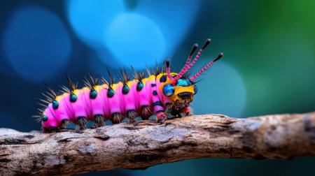 Colorful spined caterpillar with complex textures captured in macro on a branch, natural bokeh in background