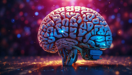 A 3D rendering of a human brain against a dark background with bokeh effect. Perfect for medical, science, or technology concepts.