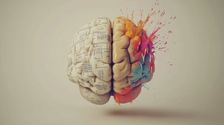 The brain has two halves: one in cool tones and the other vibrant and artistic, showing the balance between logic and creativity.