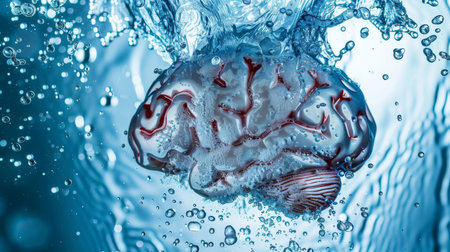 This stunning 3D artwork depicts a human brain with intricate details and floating particles, set against a dark backdrop. Perfect for visual explorations of creativity and cognition.
