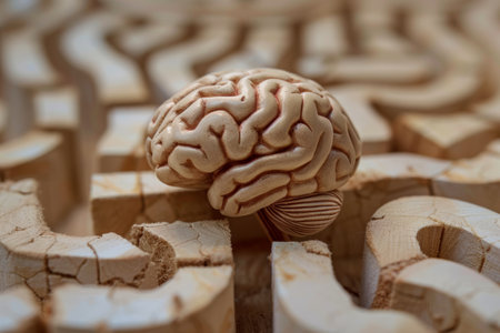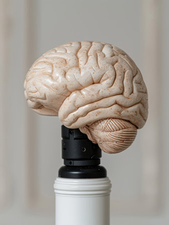 A close-up of a human brain model on a wooden desk, illuminated by soft natural light, highlighting the intricate folds and details of its surface
