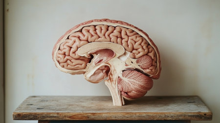 A high-resolution image of a human brain dissected to reveal its internal structures, including the cortex and cerebellum, displayed on a wooden table for a scientific feel.