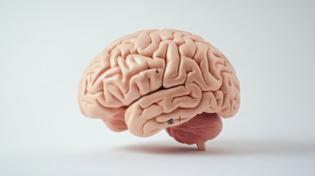 Close-up of a human brain model with intricate details, showcasing the folds and structures, placed on a clean white background