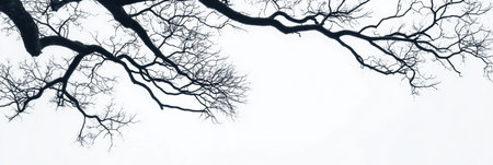 A striking black and white image featuring bare tree branches framed against a white sky. This minimalist design evokes feelings of calm and tranquility.
