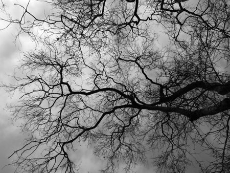 A close-up view of a tree in winter, with its bare branches reaching up against a cloudy sky. The branches are thick and intertwined, creating a complex network of lines against the gray background.