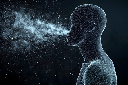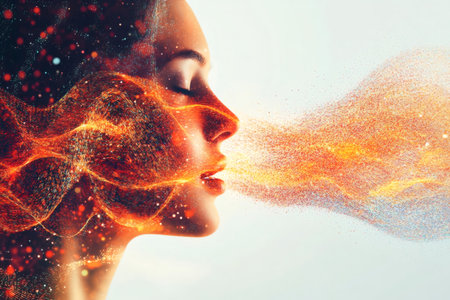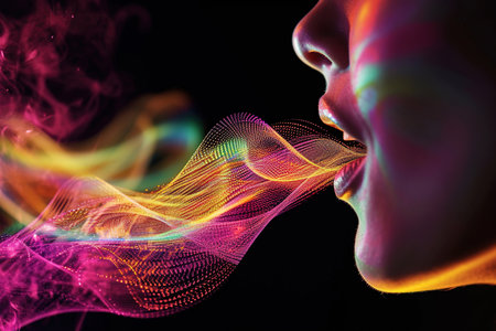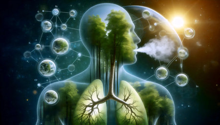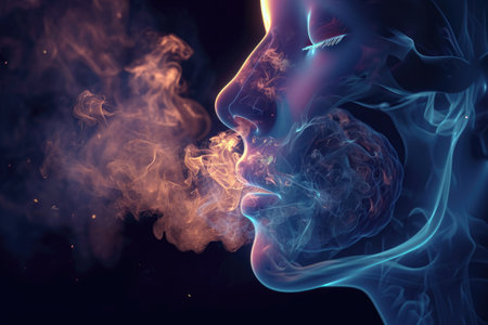 Vibrant digital art depicting respiratory anatomy with illuminated airways and smoky accents, emphasizing breathing health and airway functions.