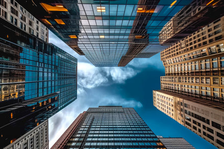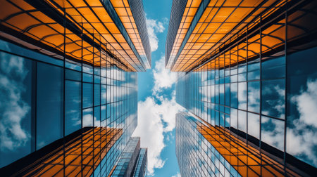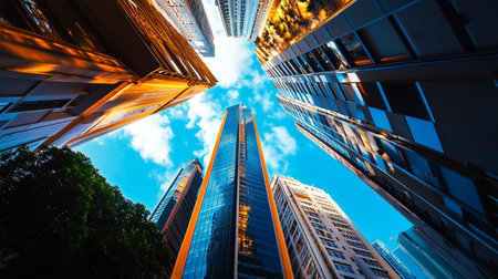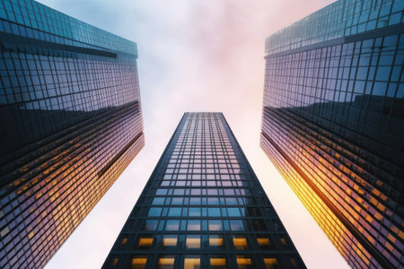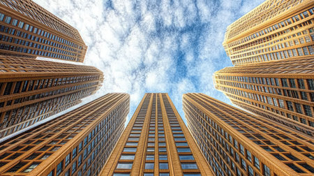 This image presents a low-angle perspective of towering skyscrapers. The buildings feature a modern architectural style with numerous windows and a sleek design. The composition emphasizes the height of the structures against a bright sky, suggesting a daytime setting. It can be used for various commercial or editorial applications.