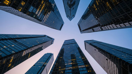Stunning city skyline with tall buildings in blue tones viewed from below, showcasing skyscrapers