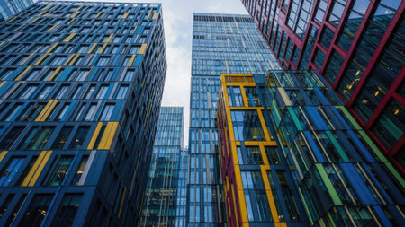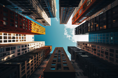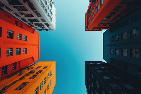 Colorful skyscrapers from a low-angle perspective, creating a vibrant and dynamic urban scene against a clear sky.