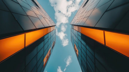 A striking perspective of two modern skyscrapers framed by reflective glass, showcasing vibrant orange accents against a cloudy sky.