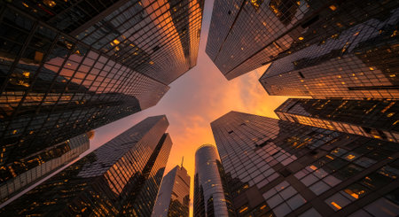A stunning view of modern skyscrapers silhouetted against a vibrant sunset sky, ideal for real estate and urban development businesses.