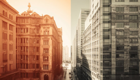 Tall buildings rise against a bright blue sky, capturing the warmth of sunlight. This urban view provides a unique perspective of architectural design and city life.