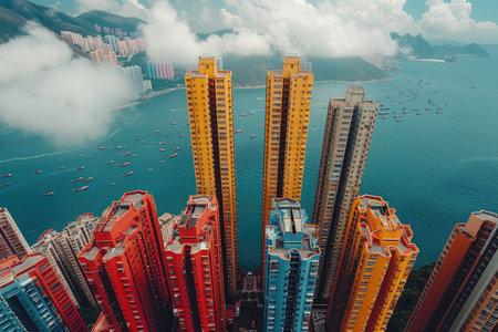 Colorful buildings reach for the sky as sunlight illuminates their vibrant hues in a bustling city.