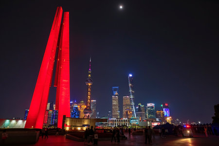 Shanghai, China - April 10, 2025: Tourist at People's Heroes Memorial Tower light up of the Bund with Oriental pearl tower at night. Famous travel destination to see modern new world.