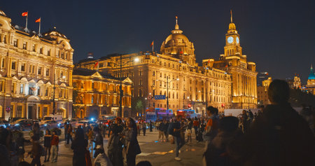 Iconic Shanghai Waterfront with Grand Structures and Busy Night Atmosphere