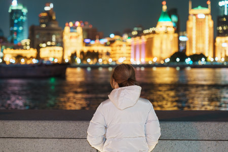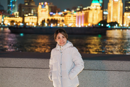 woman traveler visiting in Shanghai, China. Happy Female Tourist sightseeing Shanghai view of Lujiazui in The Bund of Shanghai at night. landmark and popular for tourism attractions. Vacation concept