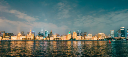 Shanghai historic architecture panorama at night lit by lights over Huangpu River