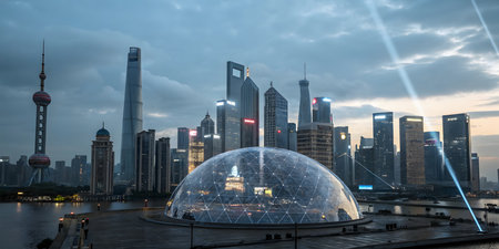 A transparent geodesic dome sits before a modern Shanghai skyline at dusk. Tall skyscrapers are illuminated, creating a futuristic ambiance. The background appears solid. The scene is peaceful and technologically advanced.