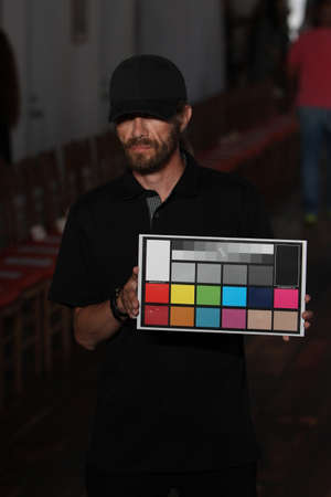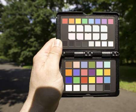Professional food photography. ColorChecker Color Rendition Chart in assistants hand.