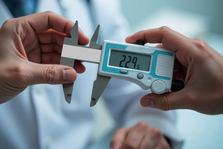 Engineer measures 3D printed sample with an electronic caliper or calliper. Metrology or quality control related close-up shot
