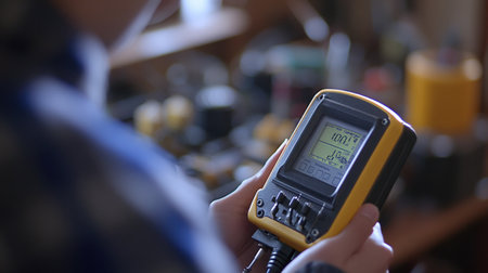 Hand holding Digital handheld light lux meter intensity of light with photodiode sensor LDR Photometer for measure the overall illuminance of an indoor or outdoor area.