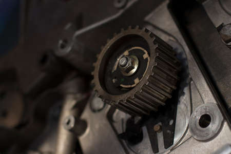 Camshaft gear of an internal combustion engine on blurred background of disassembled engine