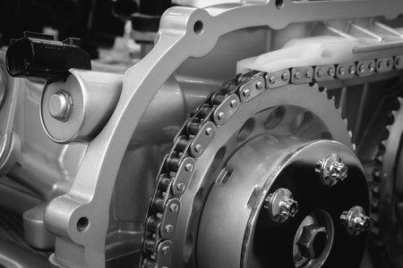 A close up of a chain drive engine. The chain is silver and has many small holes auto service concept background