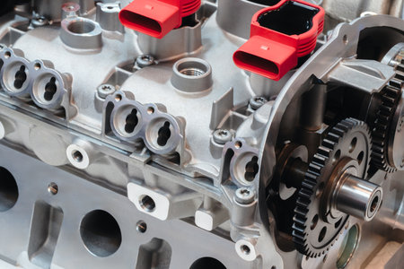 Detailed view of an automotive engine cylinder head, highlighting the intricate valve train, camshafts, and timing components. mechanical engineering and precision manufacturing.