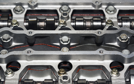 Detailed shot of a carburetor engine without valve cover. Valves, rocker arms, pushers and springs. Gas distribution of a gasoline engine. View from above. Selective focus.