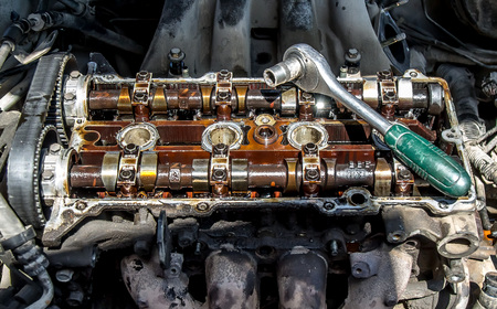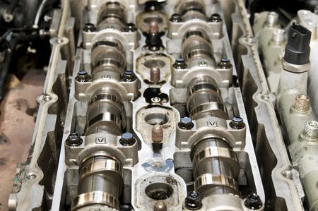 Car engine block is opened for maintenance work. The camshaft area of the cylinder head is being serviced. Bright lighting highlights the engine components during the repair.