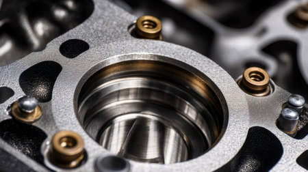 A detailed close-up of a metal engine component showcases intricate designs and precision engineering. This image captures the essence of automotive technology and innovation.