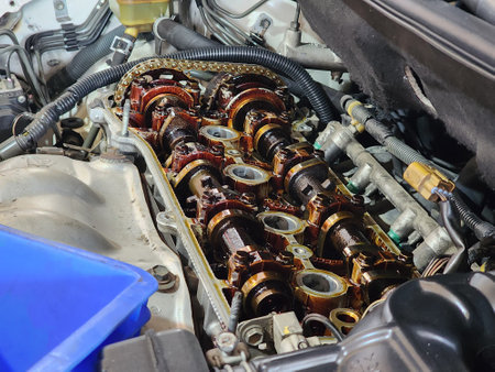 Close-up of camshafts and deposits on a diesel engine caused by EGR.