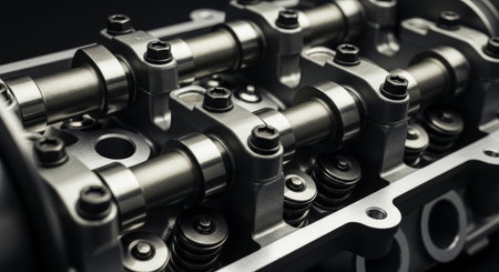 Engine cylinder head with exposed valve train, camshafts, and springs, showcasing intricate mechanical details and precision engineering.