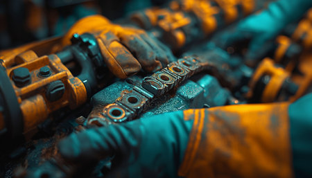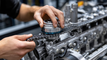 A man is working on a car engine, specifically the chain. Concept of precision and focus as the man carefully handles the chain. The scene suggests that the man is skilled in his work