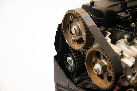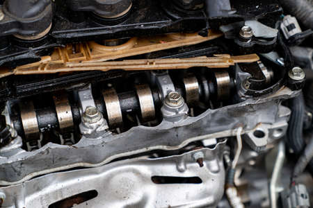 Close-up on a disassembled engine with a view of the gas distribution mechanism, chain, gears and tensioners during repair and restoration after a breakdown. Auto service industry.