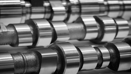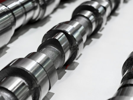 Close-up view of metallic camshafts on display in an automotive parts workshop showcasing precision engineering