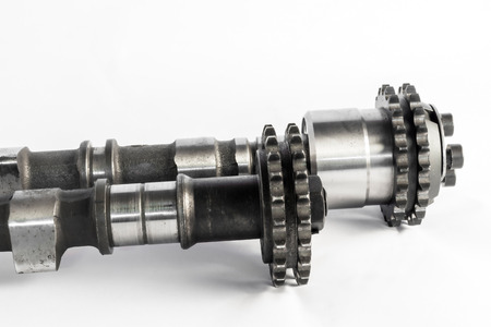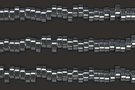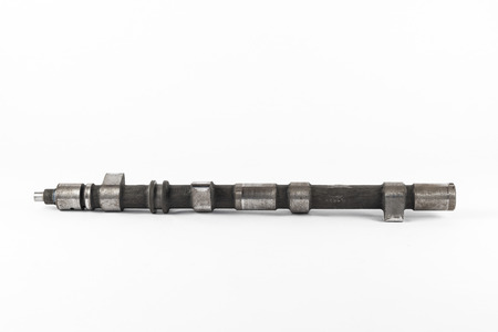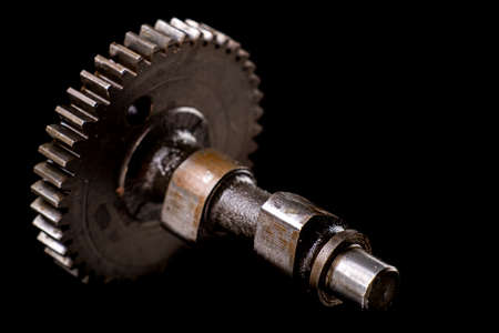 Camshaft from a small internal combustion engine. Accessories for repairing drive systems. Dark background.