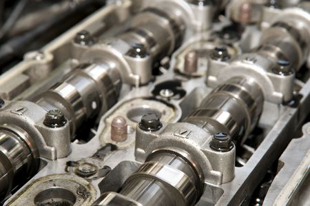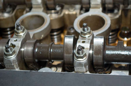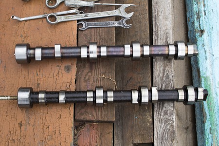 Camshaft and hydraulic compensators on the repair table. Close-up