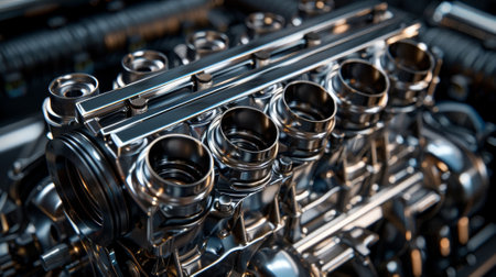 A close-up of car engine showing cylinders and pistons. engine made metal and has shiny, metallic appearance auto service concept background