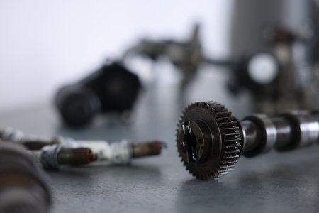 Camshaft gear of an internal combustion engine on blurred background of disassembled engine