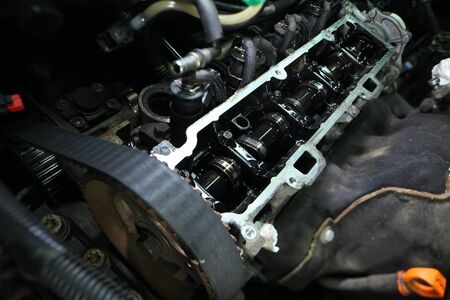 Car engine valves close up.Part of car's motor.Machinery detail of modern gasoline engine repair of cylinder head.Installing the valve of an overhauled engine.Mechanism automobile.Workshop motor car