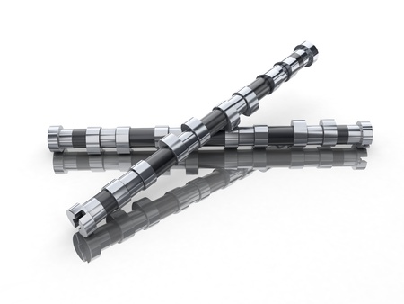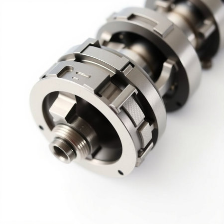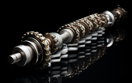 A detailed view highlighting the gleaming metallic surface and precise craftsmanship of an automotive camshaft, emphasizing its engineering complexity and polished finish.