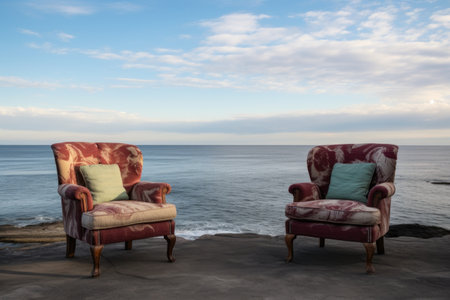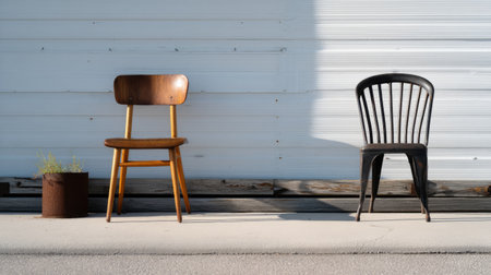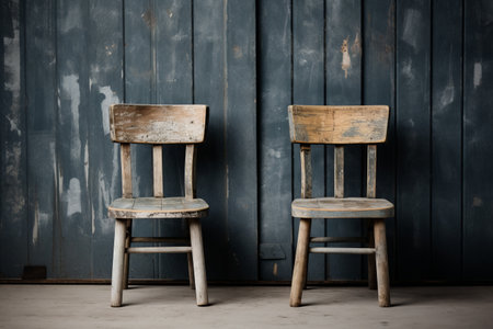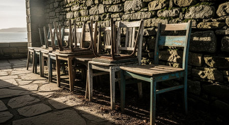 A captivating scene of empty, weathered chairs in a deserted location, illuminated by warm sunlight, showcasing the beauty of texture and nostalgia. Ideal for various themes.