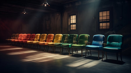 In the silence of a forgotten room, empty chairs wait in two rows under a single, harsh spotlight.