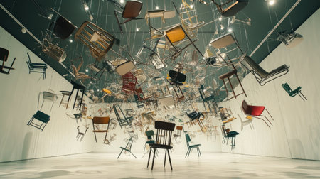 This captivating installation features an imaginative display of chairs suspended in mid-air, creating a striking visual experience in a modern gallery setting.