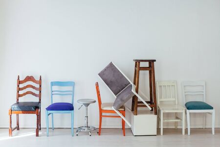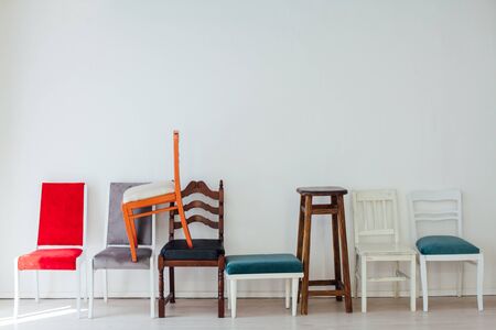 Five colorful chairs with wooden legs lined against a blank white wall on a concrete floor