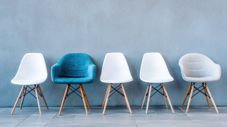 Line of modern chairs, in white, blue, and light gray, arranged in front of a light gray wall. The chairs have wooden legs and a simple design. The chairs are positioned in a way to suggest a waiting area or a reception space.